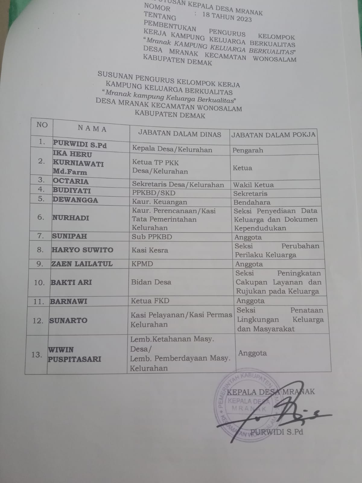Desa Mranak terdiri atas 5 Wilayah RW ( Rukun Warga ) dan 28 RT ( Rukun Tetangga ) dengan jumlah KK 118