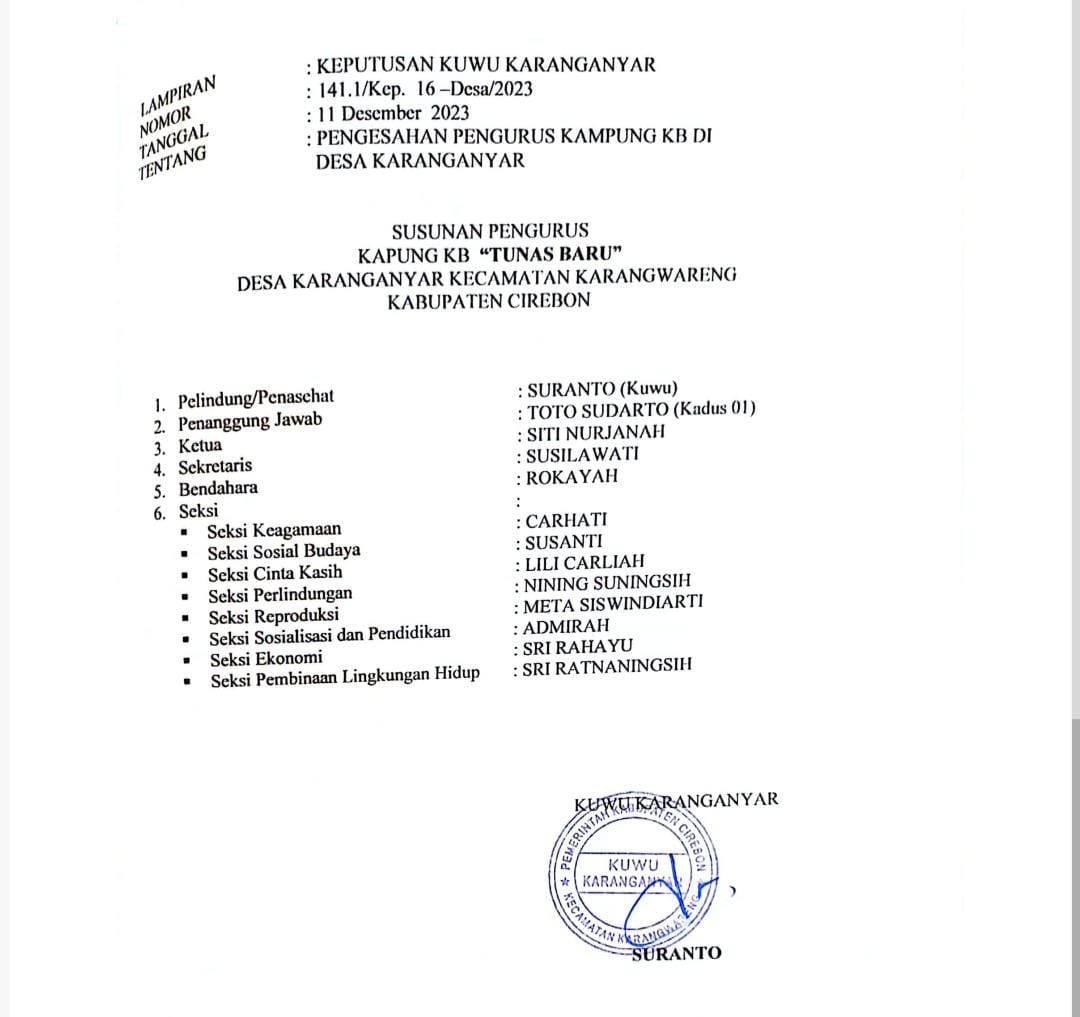 Surat Keputusan/Instruksi/Surat Edaran dari Gubernur Surat Keputusan/Instruksi/Surat Edaran dari Bupati/Walikota SK Kecamatan tentang Kampung KB SK Kepala Desa/Lurah tentang Kampung KB |